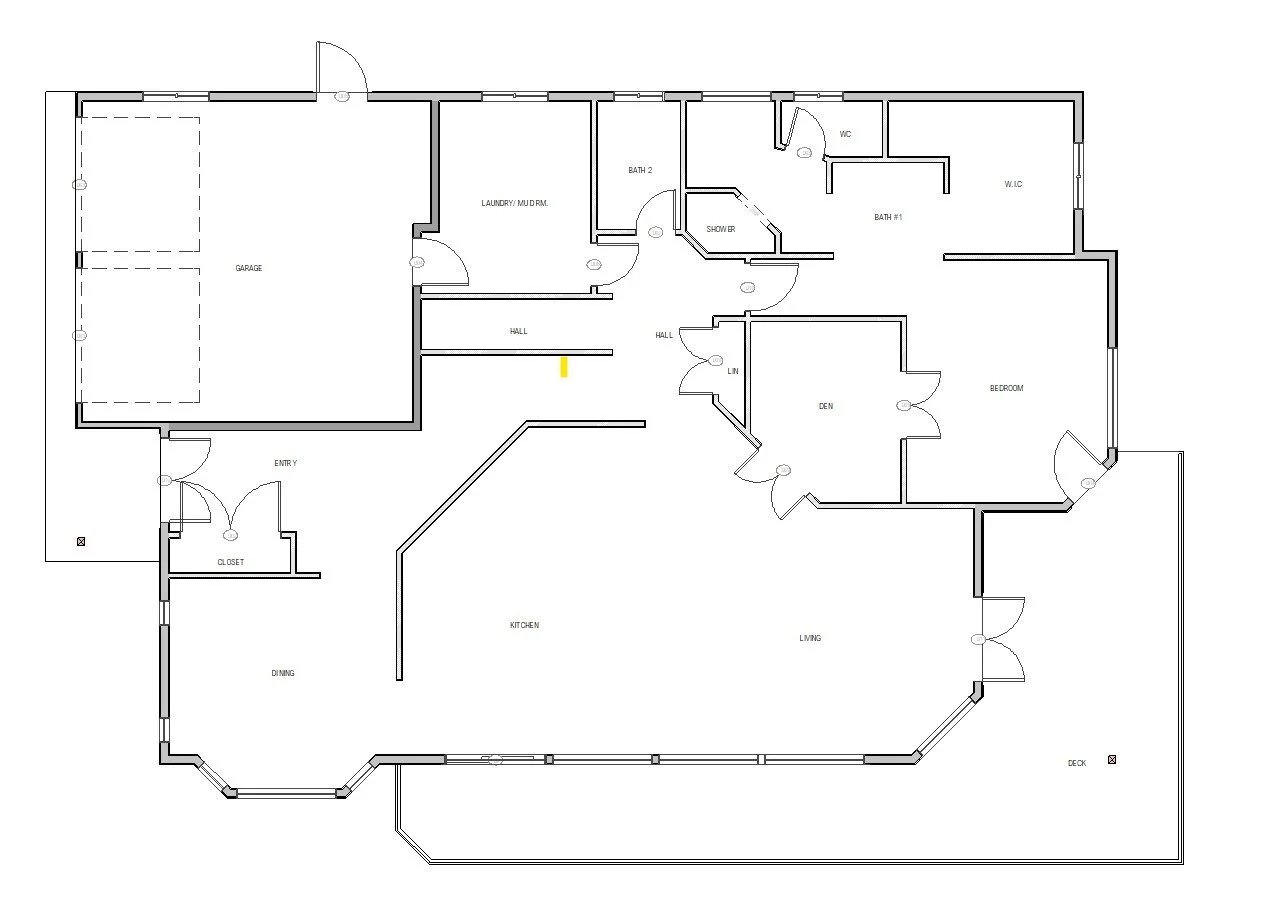 This late-1980s home had something most homes don't — a sweeping panel of windows framing the Puget Sound. But the floor plan made it nearly impossible to appreciate. Guests entering the front door were stopped immediately by a large wall, funneled into an awkward narrow hall, and had to navigate around a corner just to reach the kitchen. The kitchen itself was wrapped in a wide C-shape of walls, closed off from the living area and the view beyond. A small den with glass French doors sat between the kitchen and an undersized primary bedroom. The dining room, tucked behind its own wall near the entry, went largely unused — and with both homeowners working from home, the layout simply didn't support their lives.